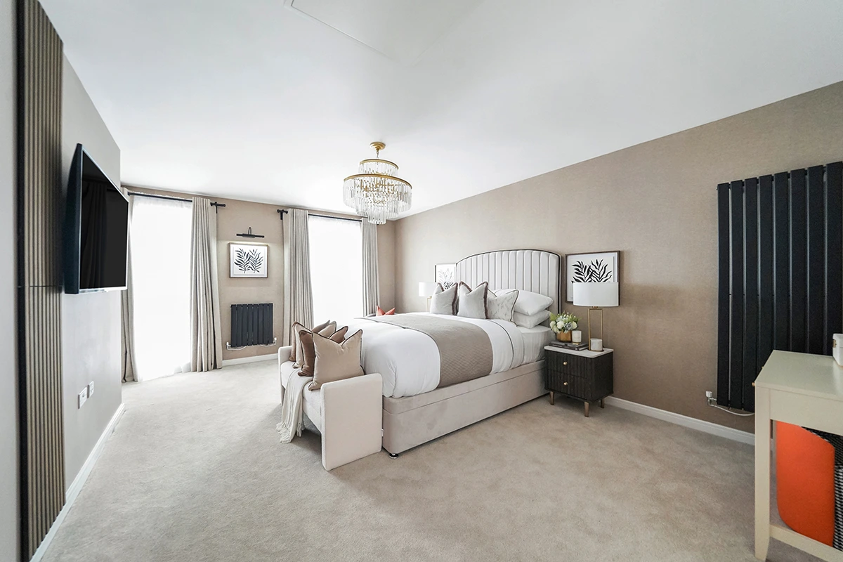 Key upgrades included replacing standard radiators with sleek, designer models and installing a custom-made TV media wall in the living room, which quickly became a striking focal point. To complete the transformation, we sourced and curated all furniture, lighting, and accessories, ensuring a consistent, polished aesthetic across every room.